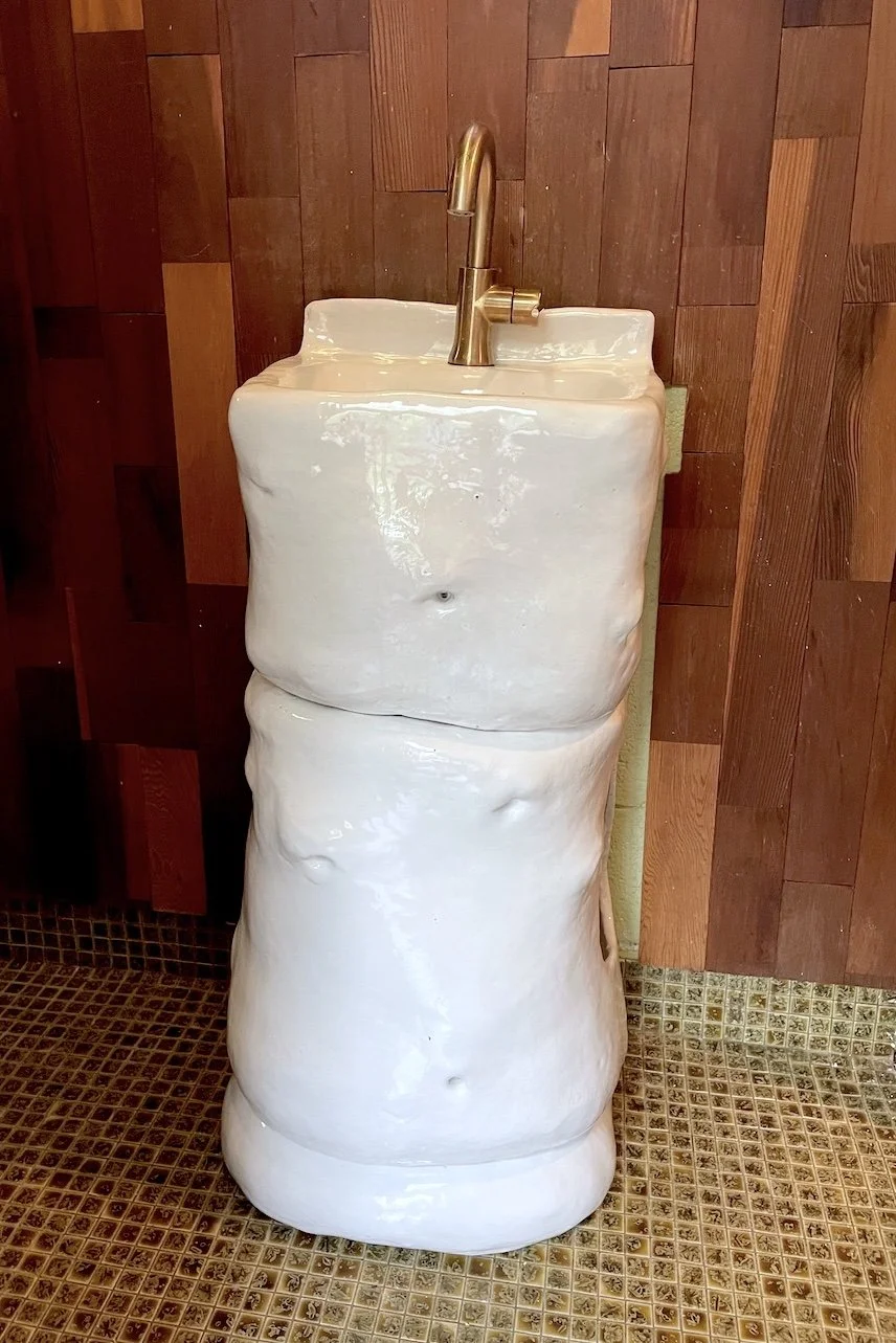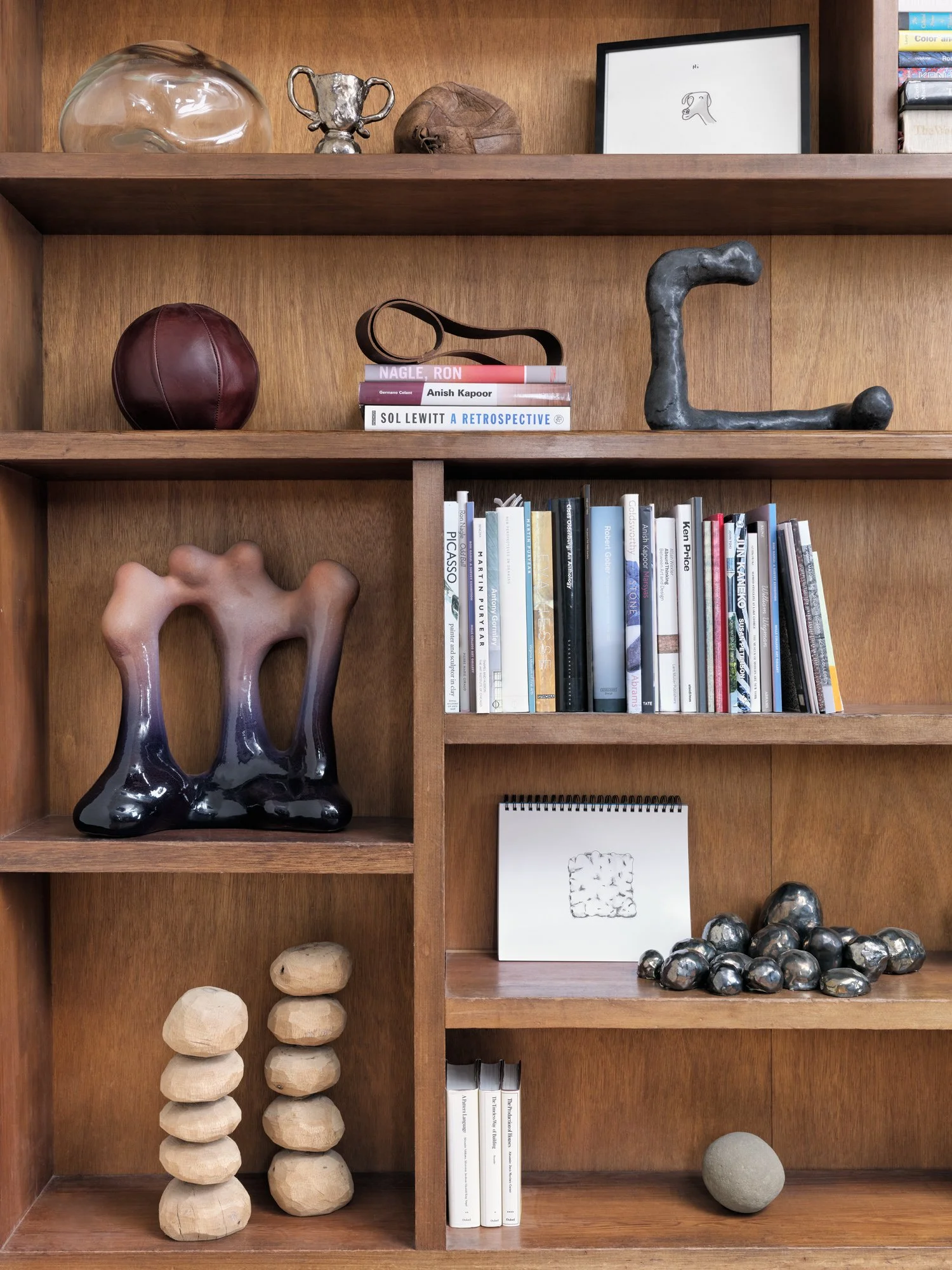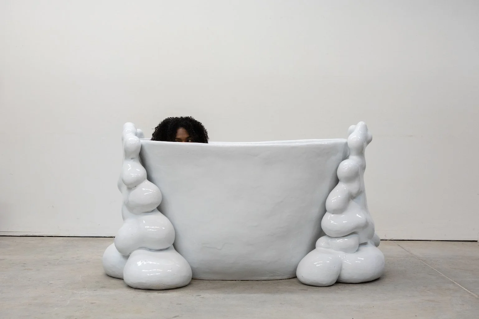 View fullsize   Oval Holder,  2023, Glazed ceramic, wood, 22” x 19” x 21”